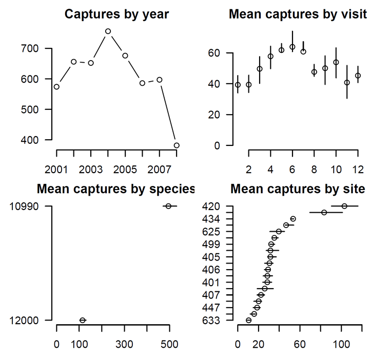 The package reads in data in the agreed EuroCES format, provides tools for plotting and summarising the data, and for producing indices of annual abundance, productivity and survival. These are some plots produced by the package: